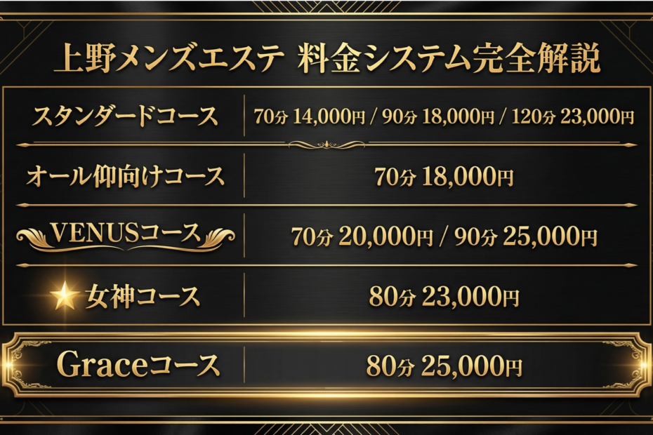 【2026年最新】上野メンズエステの料金システム完全解説 コスパ最強の選び方とGrace Tokyo全コース比較 はじめに:上野メンズエステの料金、実はシンプルで分かりやすい 「上野でメンズエステを探しているけど、料金体【2026年最新】上野メンズエステの料金完全解説|Grace Tokyo
